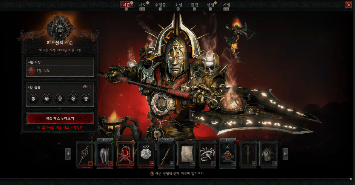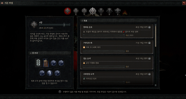 시즌 여정은 완료해야 할 임무가 있는 장으로 나뉩니다. 여정을 진행하면 새로운 전설 위상, 깨어난 불굴의 갑옷(다양한 상위 단계에서 획득할 수 있음), 무료로 기술 트리와 정복자 보드를 초기화할 수 있게 해주는 기억 상실의 두루마리 3개 등 성역의 수호자에 걸맞은 보상을 획득할 수 있습니다. 또한 여정에서는 배틀 패스의 단계를 올리는 데 사용되는 자원인 호의를 획득할 수 있습니다. 호의는 게임의 여러 콘텐츠를 플레이하면서도 자연스럽게 획득할 수 있습니다.