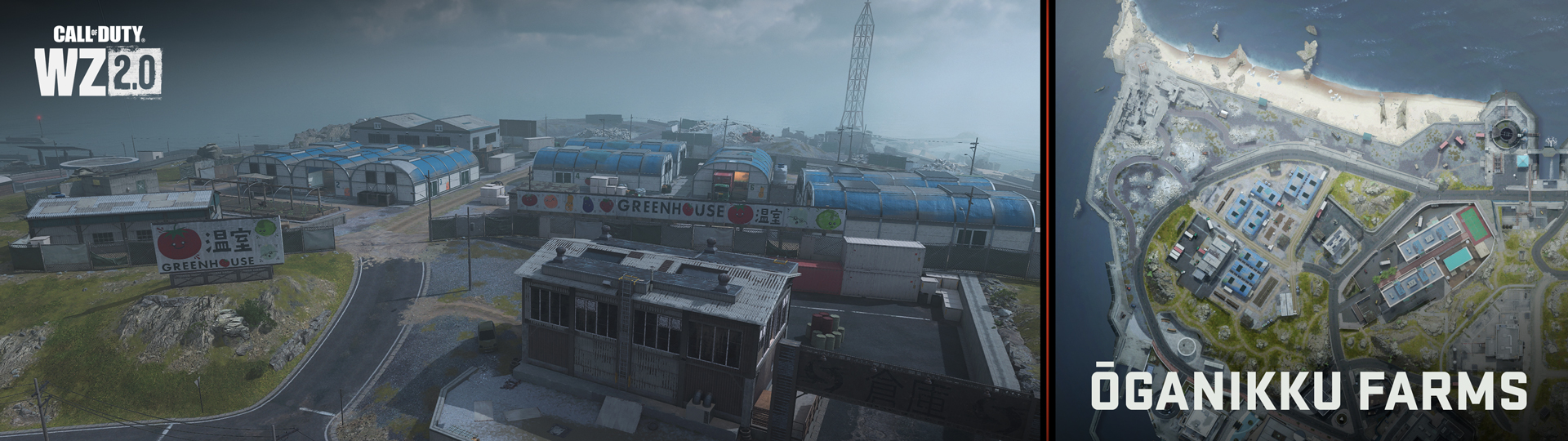 A large agricultural facility featuring a yard,loading warehouses, and eight separate greenhouse structures, all with individually numbered rooftops to aid in location. Various crops (indicated by the cartoon fruit or vegetable on the walls) are grown here. Southeast is the main entrance and additional maintenance warehouses.