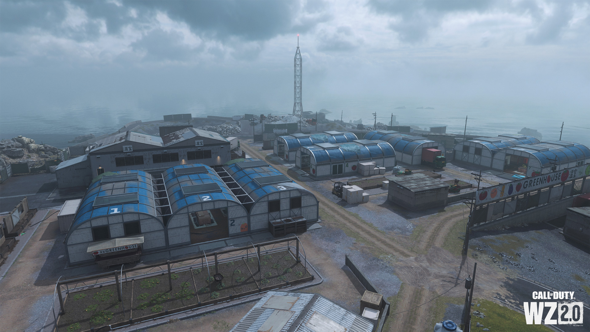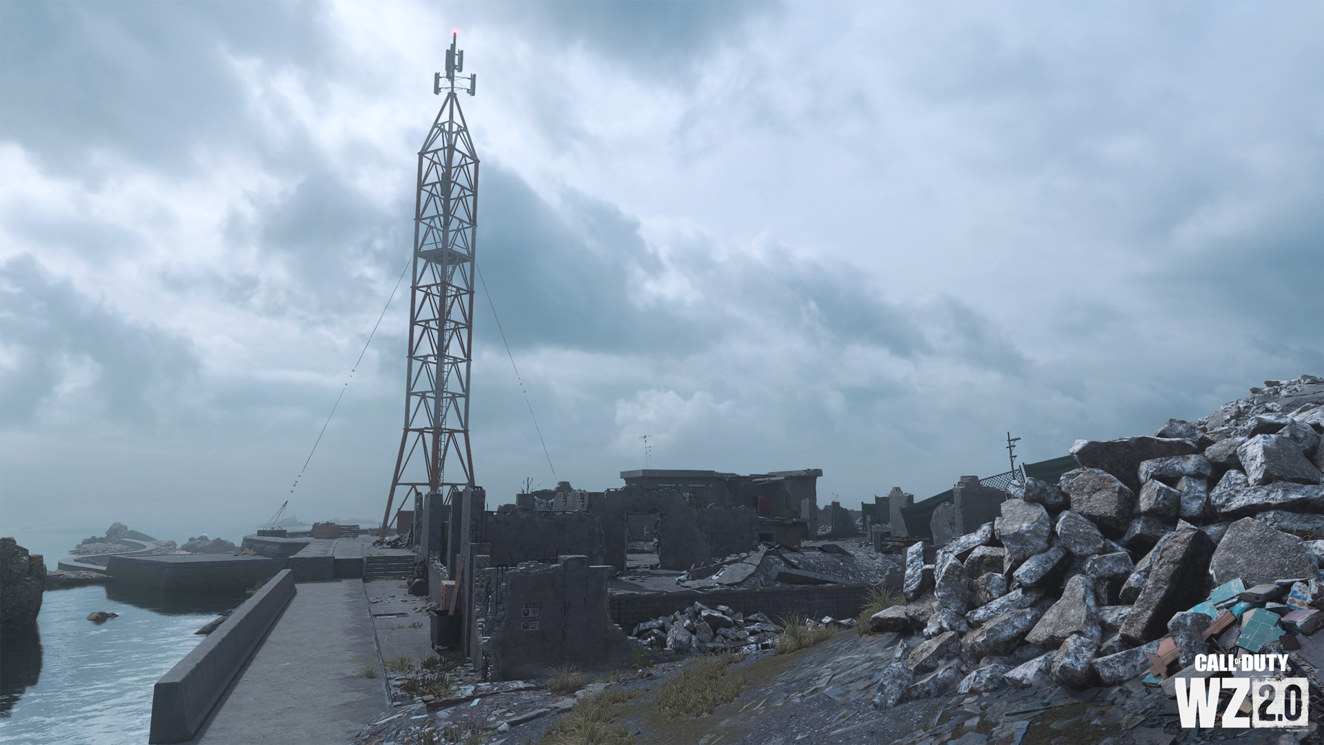 The far northwest edge of the island features a Comms Tower (one of three towers which are easily-spotted landmarks across the island) sitting on a narrow spit of sand, rocks, and a sea wall. Further in is a giant refuse pile of decaying concrete and two wartime structures undergoing extensive demolition.
