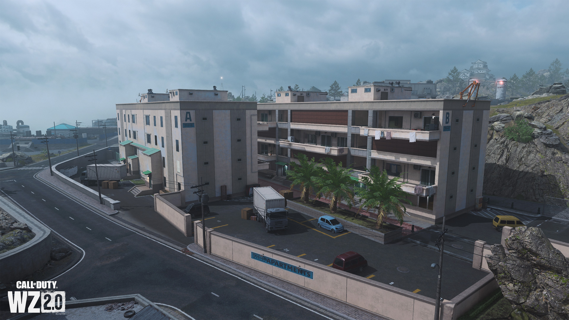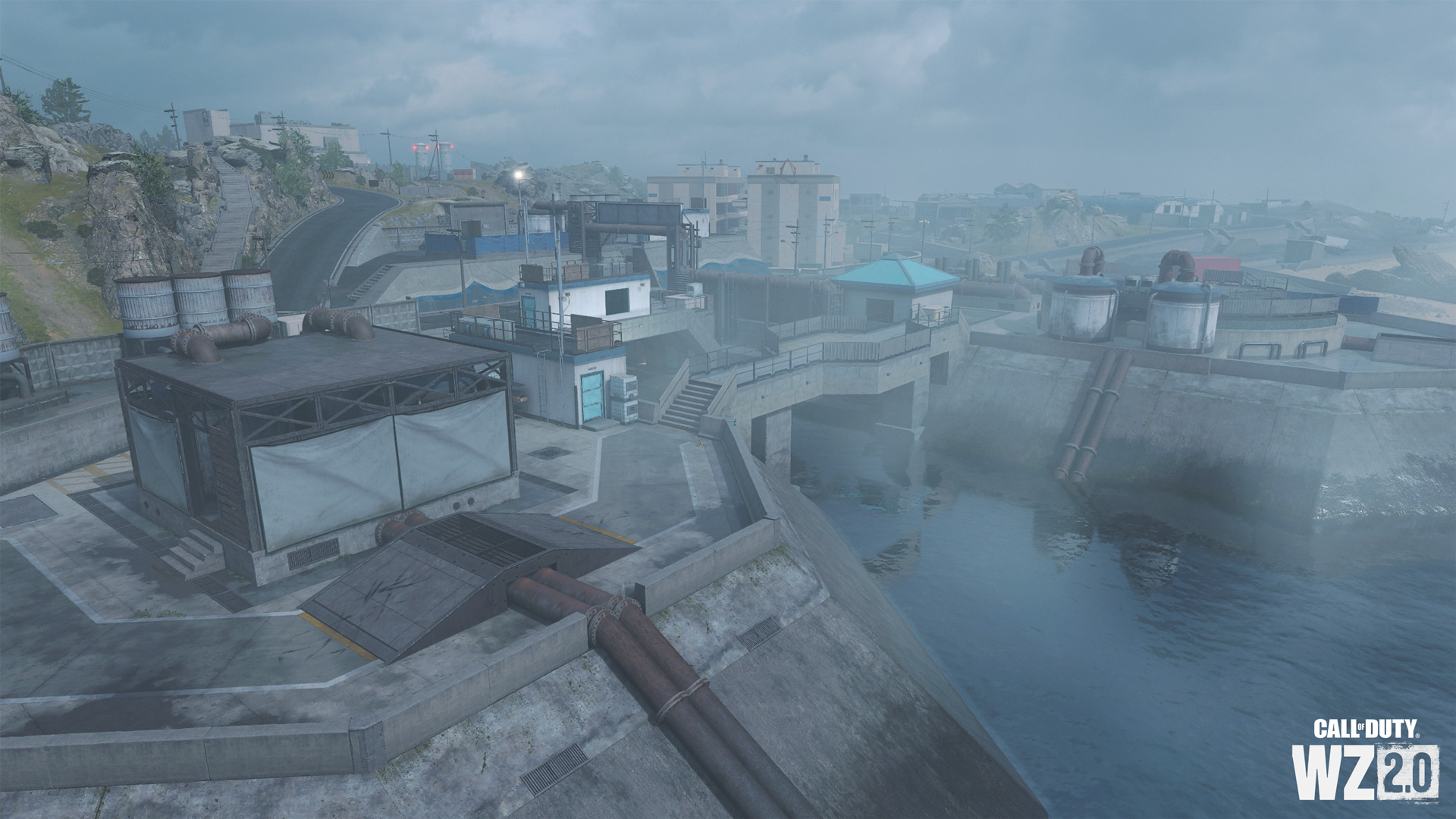 A sliver of rocky ground north of the castle has been developed into a small residential district, sandwiched between the water treatment facility (west) and comms tower, and gas station (east). Main roads surround the collection of modest wooden dwellings, all with some interior access. Some structures have two floors, while others are single-level. Southeast is a circular restroom building and a bus stop en route to Shipwreck and Port Ashika. This area of Ashika Island is defined by a thin layer of fog, which reduces long-range visibility and sight lines in specific situations. While it will not affect fast-paced, close-quarters combat situations, snipers should plan accordingly.