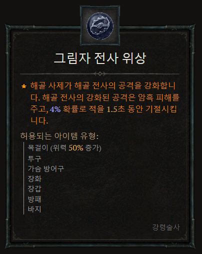 • 해골 사제가 해골 전사의 공격을 강화합니다. 강화된 공격은 암흑 피해를 주고 5%~20%  확률로 적을 1.5초 동안 기절시킵니다.