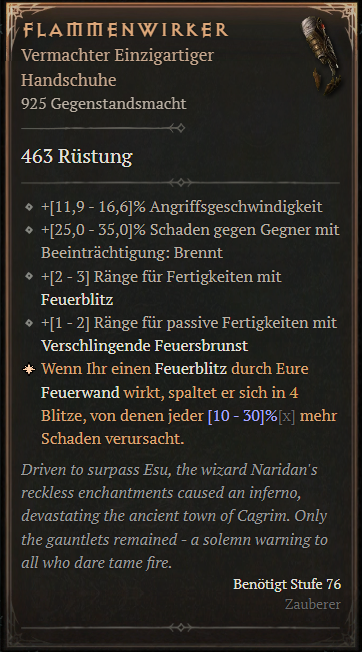 • Wirkt Ihr Feuerblitz durch Eure Feuerwand, teilt er sich in 4 Blitze, von denen jeder 80-100 % mehr Schaden verursacht.