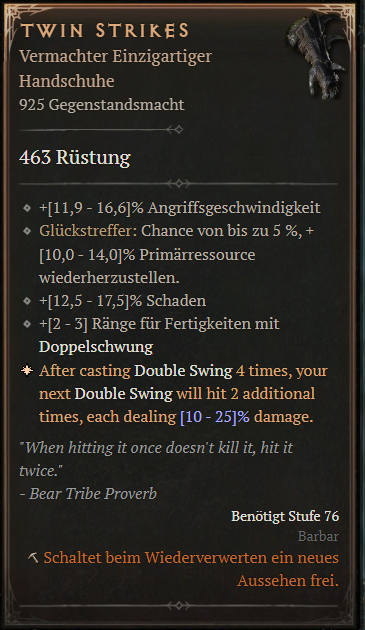 • Nachdem Ihr Doppelschwung 4-mal gewirkt habt, trifft Euer nächster Doppelschwung 2-mal zusätzlich, wobei jeder Treffer 10-25 % erhöhten Schaden verursacht.