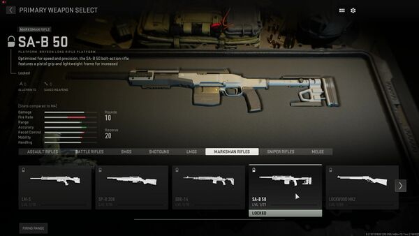 The “SA-B 50” marksman rifle is another variant in a custom chassis, which is the “XRK SP-LITE 208 Blitz” chassis from Modern Warfare combined with the buttstock of MW’s “XRK SP-TAC 208 Ultimate” chassis. Contrary to its name, which would suggest it is chambered in .50 BMG, the rifle is instead chambered in .300 Winchester Magnum.