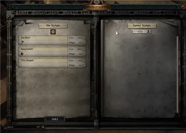 Recruiting workers involves hiring them for an initial gold cost and paying an hourly wage. Each worker can have one or more specializations, making them more efficient in specific tasks. The recruitment interface allows players to hire, fire, and reroll the list of available recruits.