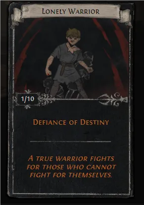 Lonely Warrior is a divination card in Path of Exile. A set of ten can be exchanged for the unique Paua Amulet, Defiance of Destiny.