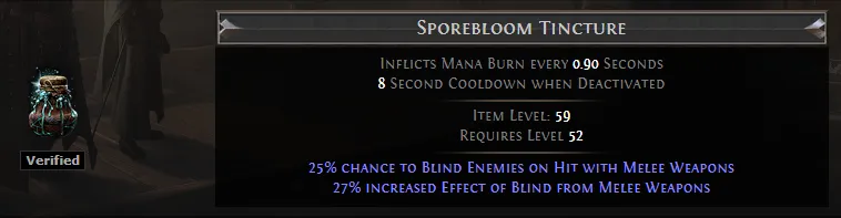 Sporebloom Tincture ia a tincture base type. Inflicts Mana Burn every 0.90 Seconds. 8 Second Cooldown when Deactivated.
